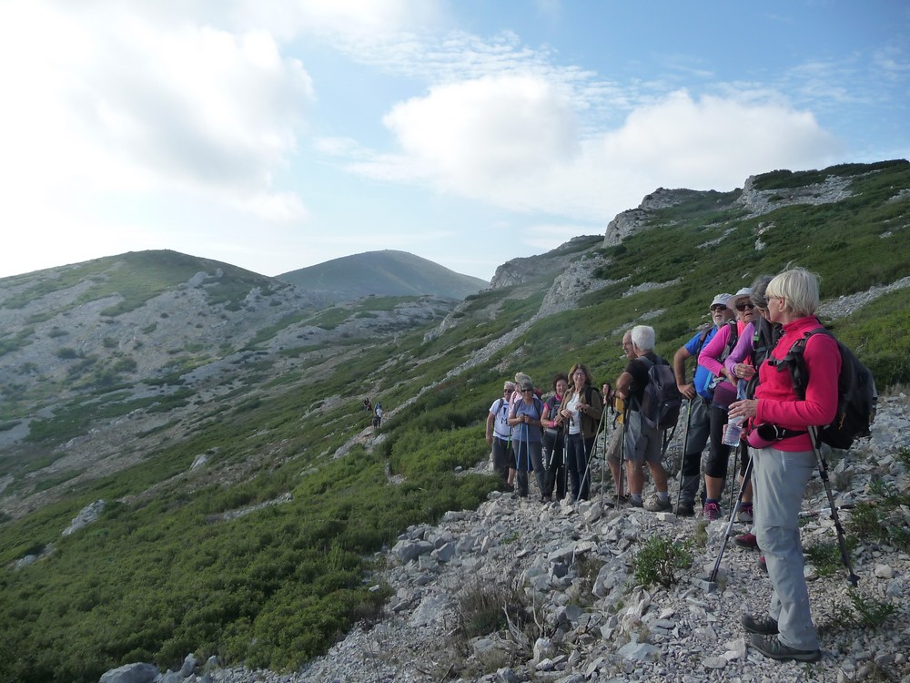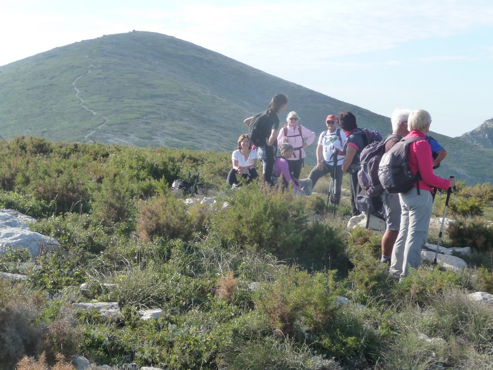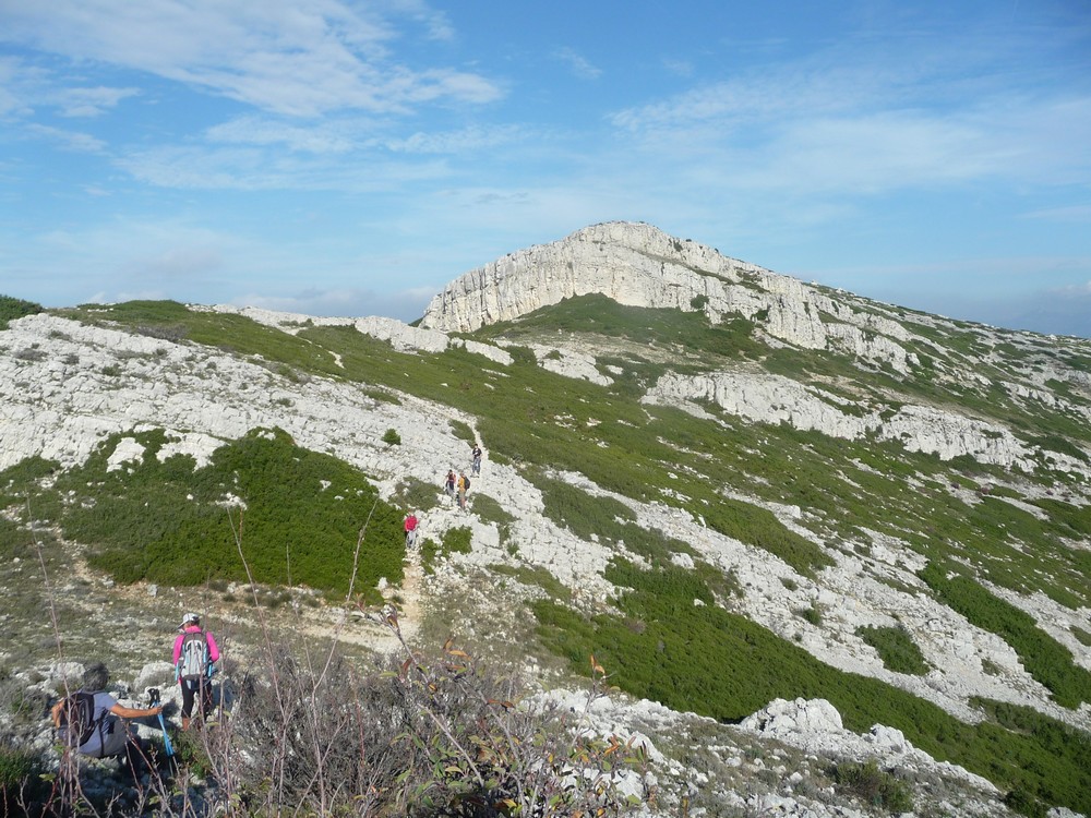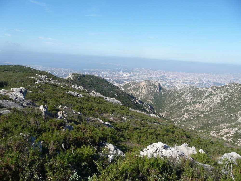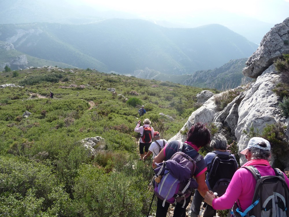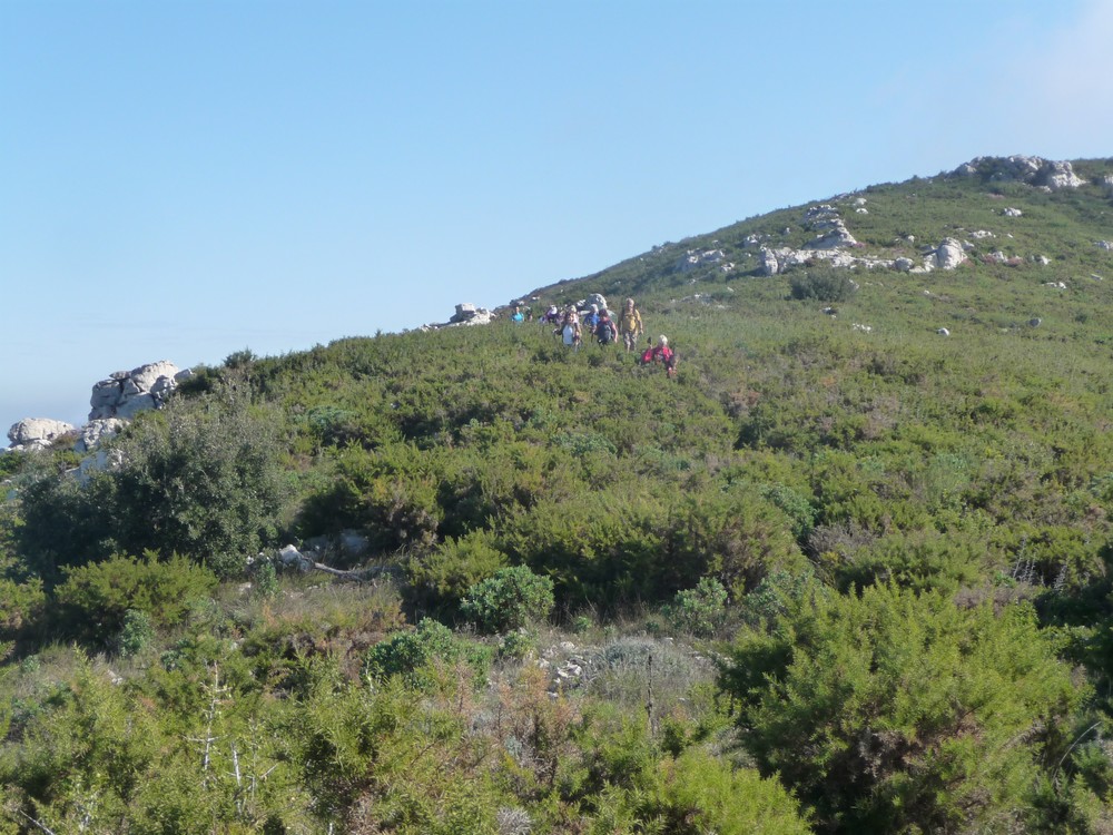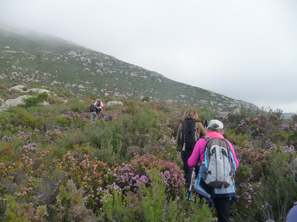 9h30, départ du col de la Gineste. Temps doux avec des entrées maritimes et des éclaircies temporaires. 17 randonneurs, c’est les vacances scolaires, des enfants et petits enfants de randonneurs nous accompagnent.On se dirige vers le sommet du mont CARPIAGNE. Le sentier est très agréable, les bruyères sont en fleurs.A mi chemin on commence a apercevoir les quartiers Sud de MARSEILLE.Après 300 m de dénivelé nous arrivons sur le mont CARPIAGNE. Vue grandiose sur toute la ville de MARSEILLE et la vallée de l’Huveaune.On se dirige vers l’ouest pour trouver une petite sente qui nous amènera sur la muraille de Chine.Sente a peine visible, les ajonc de Provence griffent les mollets.Nous arrivons sur la muraille au dessus de VAUFREGES (route de CASSIS). Très impressionnant.Nous remontons sur le mont CARPIAGNE pour prendre le pique nique face au GARLABAN.Puis direction le mont LANTIN, toujours des entrées maritimes avec quelques percées du soleil.Face à nous le mont LANTIN, le sentier qui nous y mène est sans aucune difficulté.Nous ne trouvons pas la grotte signalée sur la carte IGN. Il est temps de retourner au mont CARPIAGNE. Petite pause avant d’attaquer la dernière montée.Il faut descendre la sentier emprunté ce matin. Très pentu au départ il faut prendre quelques précautions. Il est 16h lorsque on retrouve nos véhicules. Le pot de l’amitié est pris place Portalis à ST CYR. Magnifique randonnée inédite. 12 kms, +620m.