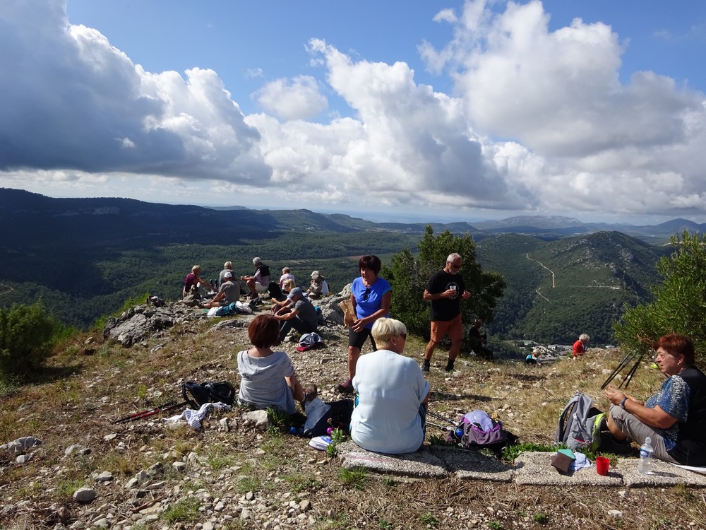 Après 7 kms de montée facile nous arrivons à 11h40 au sommet du Mont CRUVELIER au dessus de GEMENOS. Vue grandiose à 360°, la vallée de l’Huveaune et MARSEILLE, de l’autre côté Notre Dame du MAI et les Monts CAUME.